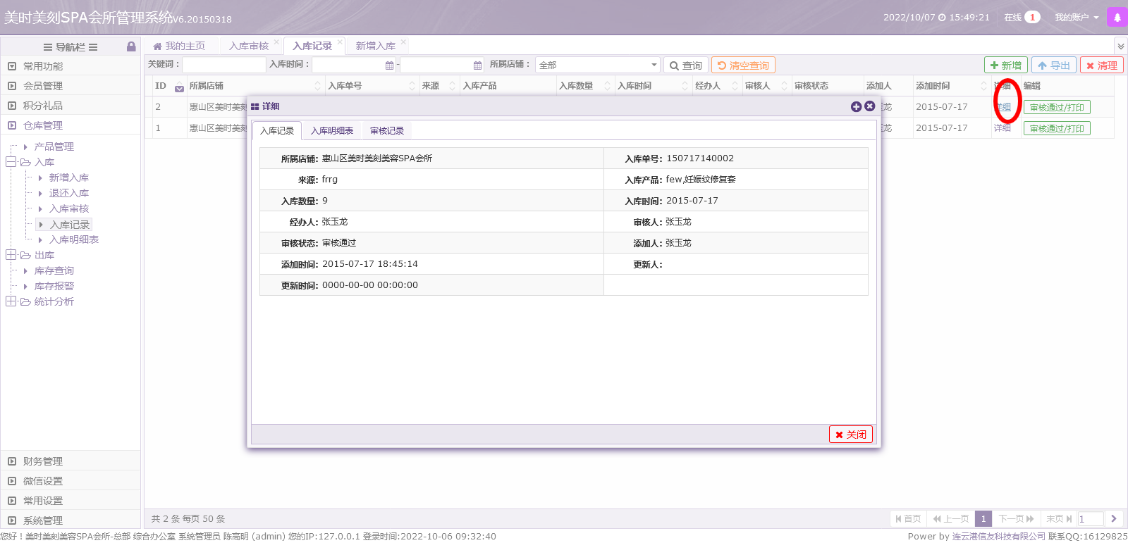 美容SPA连锁店面管理系统介绍(NO.8.2-产品入库记录管理2)