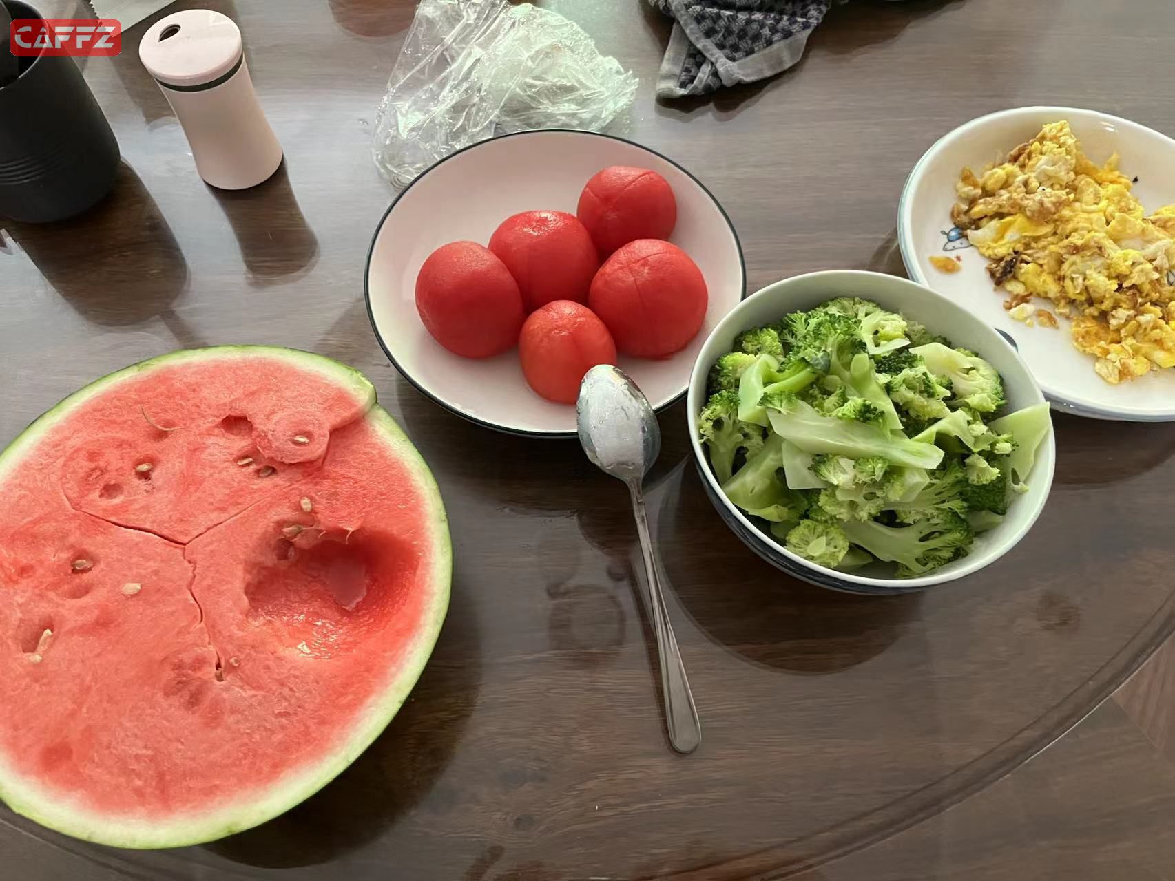 Title: 番茄+西兰花+炒滑蛋+西瓜