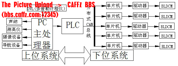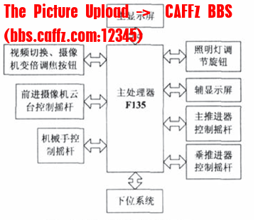 小型水下观测机器人主要由人机交互平台、上位系统、下位系统、摄像机四部分组成,操作人员通过有线遥控,结合人机交互界面上的水下视频图像,只需扳动上位系统控制面板上相应的运动控制按钮即可实现对水下机器人的运动控制,操作简单、实用。图2-3为水下机器人控制系统框图: