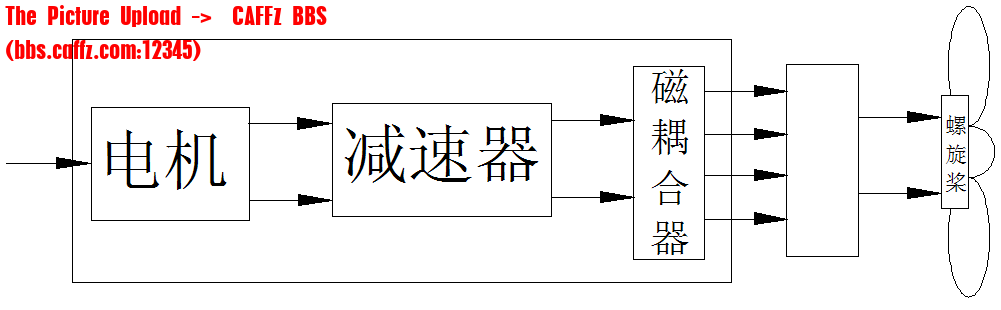 采用磁耦合器就是利用电磁力传递扭矩,这样减速器和螺旋桨之间没有直接的机械联系。依据磁场传递扭矩,密封问题很容易解决,只要用非导磁材料将电机、减速器包围起来就解决了动密封难题。采用磁耦合器,推力器的效率略有下降,但性能基本上不受影响。电机的转速与螺旋桨的转速不一定完全匹配,为了得到较高的效率,需要采用减速器,有时为了减小尺寸,采用高速电机(例如采用10000转/分以上的高速电机),这时也需要减速器。这样组成的推力器如图2-5所示。