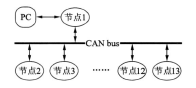 总线型结构的所有节点都共享一个公共的物理通道(即总线)。具有延迟小、速度快、易扩展、单个节点故障影响小的优点。本系统即采用总线型拓扑结构, 系统采用单片机作为控制单元完成机器人控制系统中的各种控制任务(如传感器控制、电机驱动器控制和通信模块控制等)。各功能单元直接挂接在CAN总线上,成为控制网络中的一个节点,从而构成多主机结构,即每个节点均为一个主机,通过CAN通信协议协同完成控制任务。将CAN总线的分布式控制网络应用于水下机器人中。总线上各节点完成不同的任务和功能,它们大部分时间并行工作,必要时通过总线与其他节点进行通信。如图3-1所示。CAN总线是一种多主总线,理论上任何一个节点都可以作为主节点。在控制系统中设置与上位PC机相连的节点1为上位节点,其它节点为底层节点。PC机通过串口与节点1上的CPU通信, CPU再与CAN收发器通信,实现信息在CAN总线上的发送与接收。节点1与12个底层节点根据应用的不同具有不同的功能,但它们都具有与CAN总线通信的能力,上传数据和接收数据。
