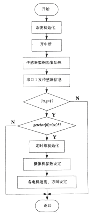 上位系统程序主要完成系统上电初始化,控制面板各按键、摇杆信息的采集,液晶模块显示,与下位系统的通讯等工作。它采用顺序式结构往复运行。运行过程中可以被中断子程序中断,执行完中断子程序之后返回断点处继续执行主程序。下位系统程序主要完成电机速度、方向设定,各传感器信息的采集,与上位系统的通讯等工作。同上位系统一样,也采用了顺序结构往复运行。系统上电后,MSP430F149 微处理器首先进入系统初始化程序,包括时钟配置、I/O 口的初始化、外设模块的初始化等。初始化结束后,开中断,处理器进入串口接收数据的判断循环当中[7]。程序流程图如图3-5 所示。