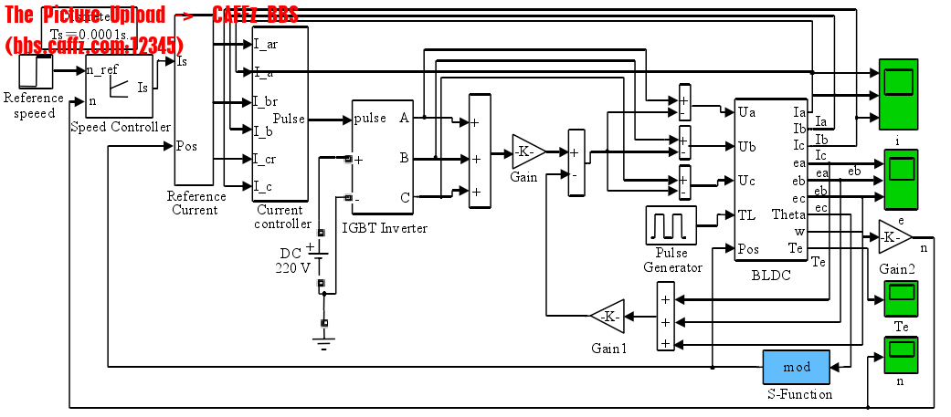 在Matlab7.0的Simulink环境下,利用SimPowerSystemToolbox提供的丰富模块库,在分析BLDC数学模型的基础上,提出了建立BLDC控制系统仿真模型的方法,系统设计框图如图5-3所示。BLDC建模仿真系统采用双闭环控制方案:转速环由PID调节器构成,电流环由电流滞环调节器构成。根据模块化建模的思想,将图3所示的控制系统分割为各个功能独立的子模块。图5-4即为BLDC建模的整体控制框图,其中主要包括:BLDCM本体模块、速度控制模块、参考电流模块、电流滞环控制模块、转矩计算模块和电压逆变器模块。把这些功能模块和S函数相结合,在Matlab/Simulink中搭建出BLDC控制系统的仿真模型,并实现双闭环的控制算法,图中各功能模块的作用与结构简述如下。