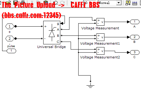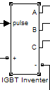 逆变器对BLDC来说,首先是功率变换装置,也就是电子换向器,每一个桥臂上的一个功率器件相当于直流电动机的一个机械换向器,还同时兼有PWM电流调节器功能。对逆变器的建模,本文采用Simulink的SimPowerSystem工具箱提供的三相全桥IGBT模块。给IGBT的A、B、C三相加三个电压表,输出的Simulink信号可以与BLDC直接连接,如图5-12所示。逆变器根据电流控制模块所控制PWM信号,顺序导通和关断,产生方波电流输出。
