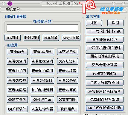 WQQ-实用小工具精灵V2.0最终版 既时聊天 群发 QQ基本资料查看 QQ文本防盗加密(自己的密码加密,有工具不知道密码也解不了密-由于本人电脑被洗东西所剩无几无赖自创的) QQ登陆用bat文本处理(看什么木马能有这么牛-怎么记录密码和Q号) 其它功能自己体会 V2.0 增加破2带密码保护常用网地址 和常用油箱登陆 下载自己杀毒