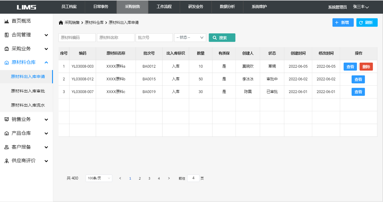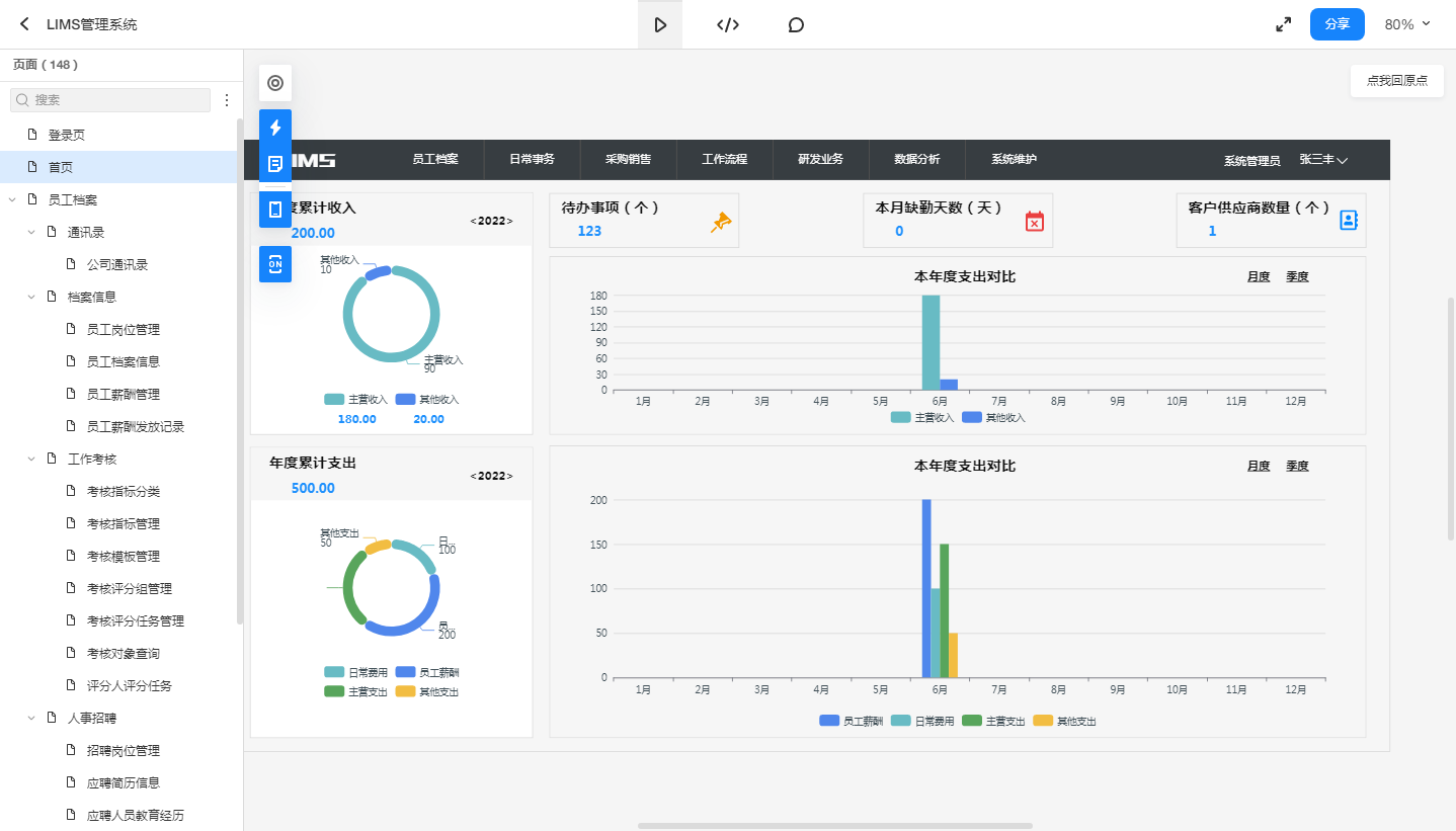 LIMS系统原型 进度汇报: 本周已经完成了LIMS系统中的 ‘员工档案’、‘日常事务’、‘采购销售’、‘工作流程’、‘研发业务’ 这些模块的页面制作,剩下 ‘数据分析’、‘系统维护’ 这两个模块,接下来继续完成。 原型的实时线上预览链接: