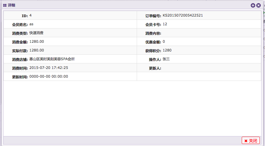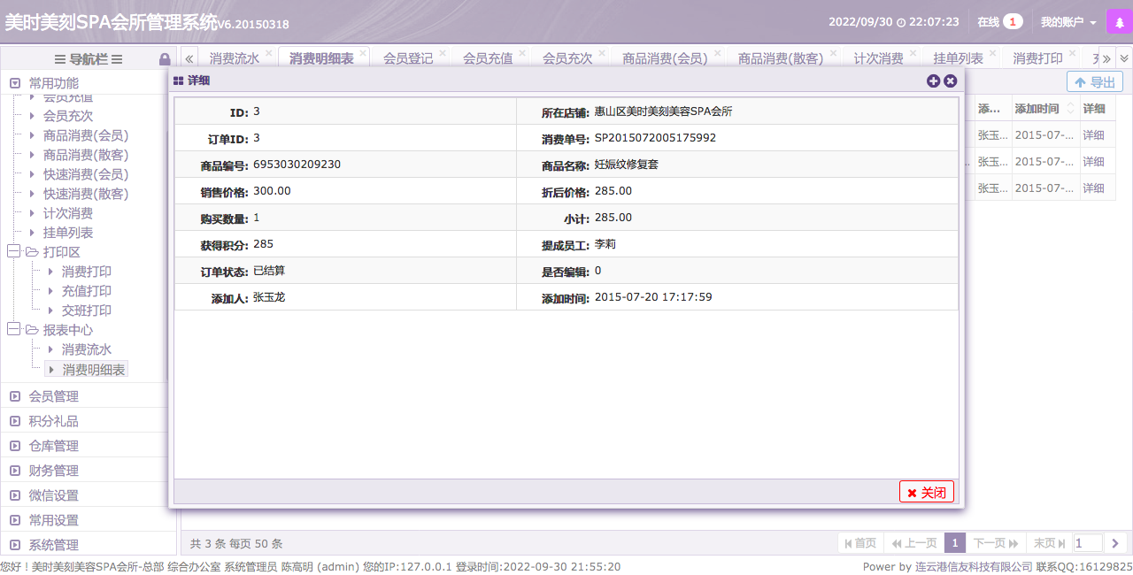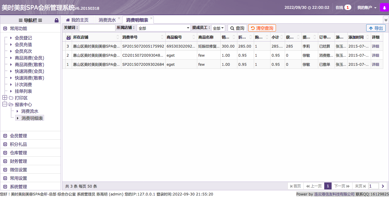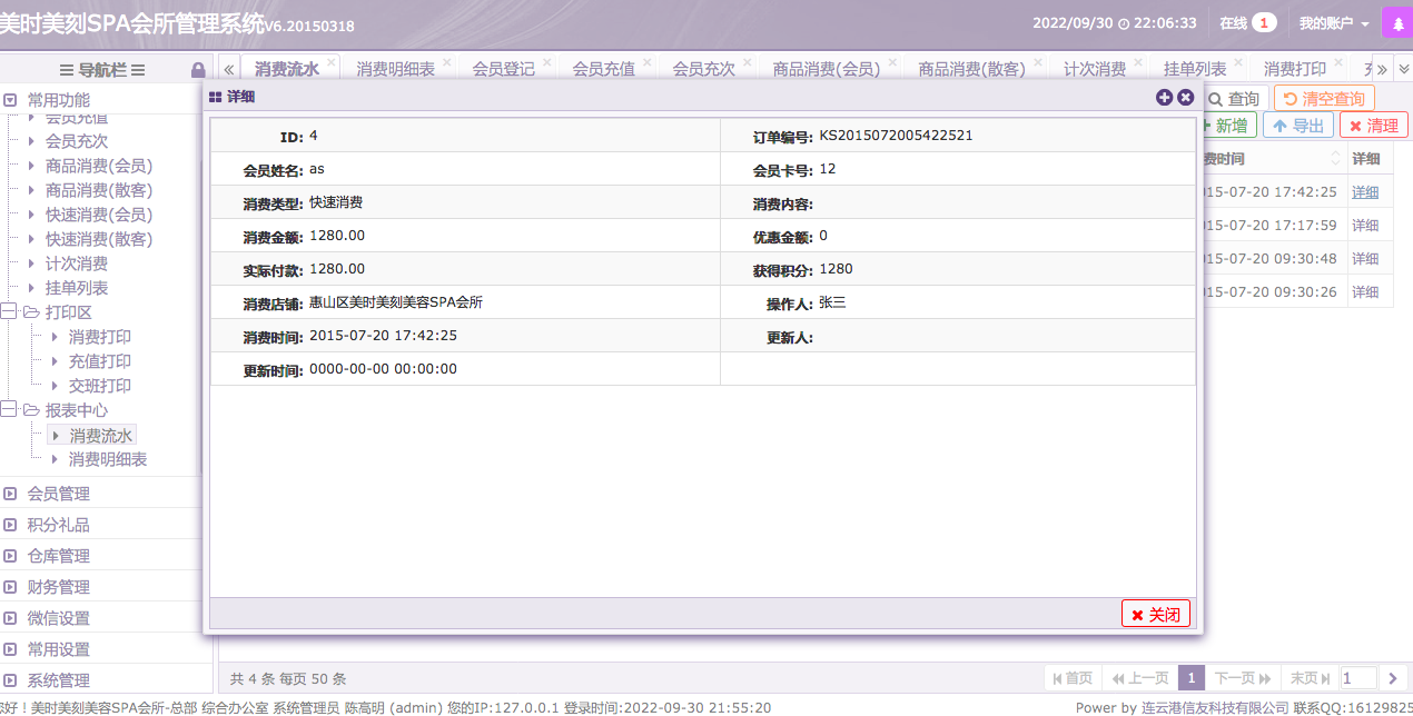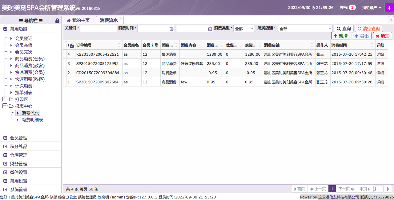 美时美刻SPA会所管理系统V6.20150318适合用于美容院、店面管理系统介绍(PHP+MYSQL开发,框架是THINKPHP)此店面管理系统,共计7个模块。 开发公司:Power by 连云港信友科技有限公司 联系QQ:16129825 我将会在后续7个帖子分别介绍7个模块的功能。 1、会员管理。 2、积分礼品管理。 3、仓库管理。 4、财务管理。 5、微信管理。 6、常用设置管理。 7、系统设置。 第一个模块介绍--会员管理。 1、此系统在会员管理方面考虑较为周全,有会员开卡登记、会员充值、会员充次管理。 会员营销似乎是一个商家必须会选择的路径,毕竟拥有强大的会员群,是支撑店铺、品牌不没落的一项重要办法。 此系统具备有会员登记消费功能,有会籍的消费者可以享受会员服务,在充值会员的时候可以选择会员卡的类型,比如充值消费满减、卡内存值消费、按次数消费会员卡可以根据充值类型来进行消费扣减。 2、商品消费管理,可以区分是否会员进行消费,如果是会员消费即可扣减卡内存值。如果不是会员可以区分按照散客消费进行支付、扣减。 3、快速消费与商品消费可以区分出,服务、按摩型的消费与物品交易型的消费。 4、独立的计次消费模块,可以统计使用会员卡进行消费的按次收费的服务、商品,比如一些激光治疗仪器、美容仪器、美容用品。 5、挂单列表,可管理某些客户的挂单。 6、打印区域,可管理打印机、各类大小的打印机、云打印机进行消费小票、充值凭证、交班小条打印或停车票打印。 现介绍模块:7、报表中心展示的是财务部分内容,比如店铺的日流水、月流水、消费明细表,日进账、月进账信息。以便店主进行管理。 本帖会介绍第一个模块的第7个功能报表中心。 报表中心: 可以查看每日的消费情况,如图: